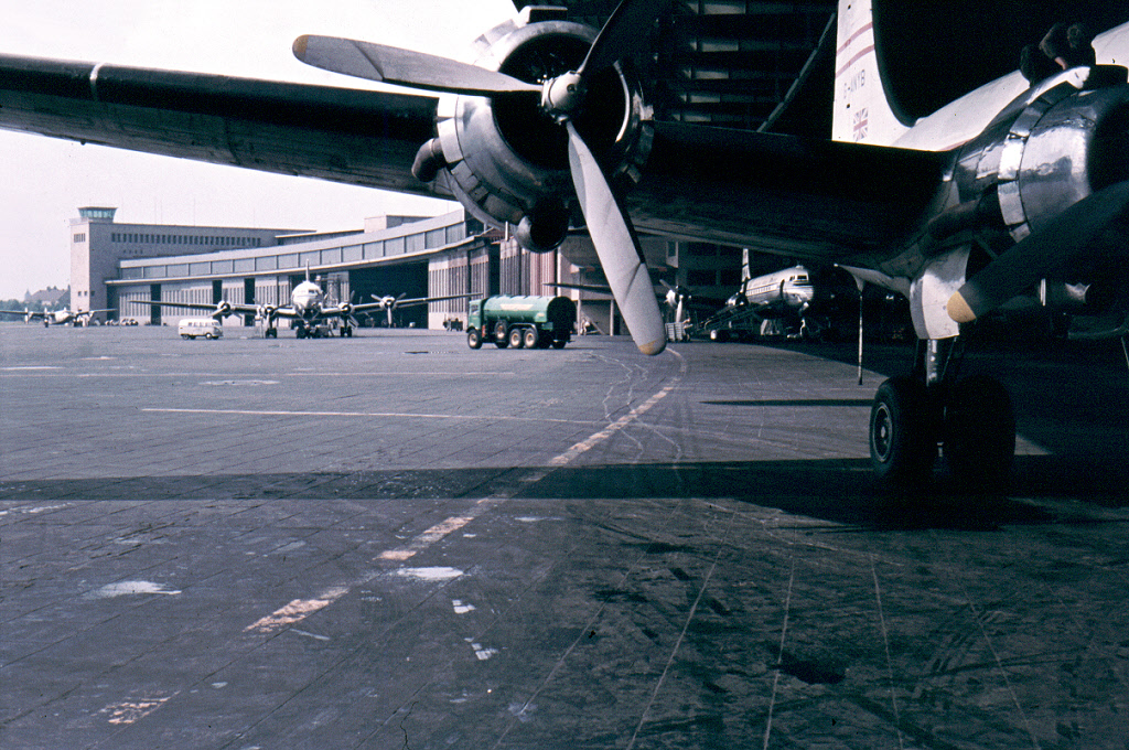 Blick auf das westliche Vorfeld mit zwei Pan Am DC-4, Skyways Avro York und im Vordergrung Air Charter DC-4 - THF 1957 - (photo BFG Archiv)
